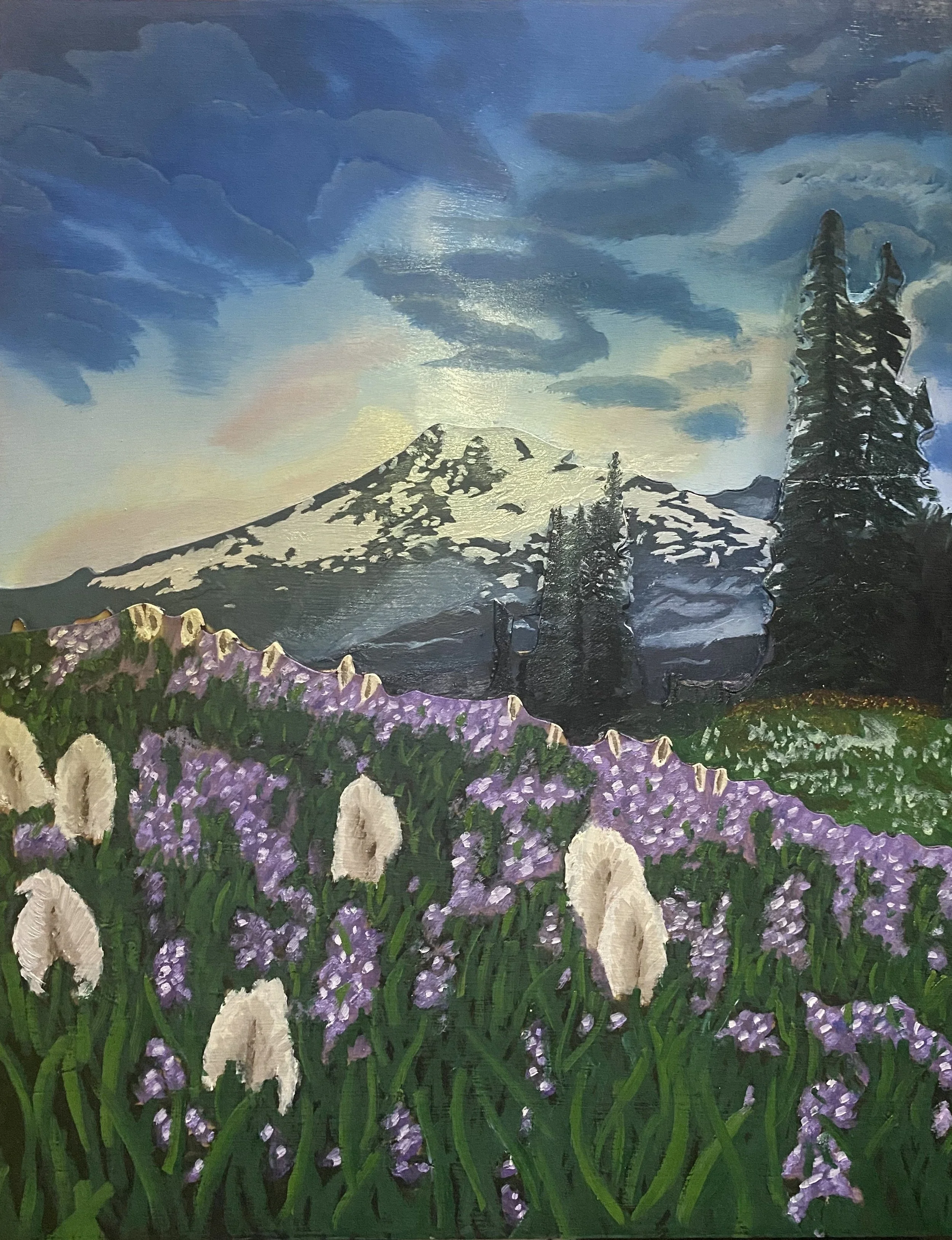 This 3D oil painting of Mount Rainier, carved and layered from wood, merges landscape realism with sculptural depth. The snow-capped peak rises beneath a dramatic twilight sky, its shifting hues of blue and violet suggesting both majesty and transience. The carved foreground of wildflowers, painted in vibrant purples and whites, creates a tactile relief that bridges painting and sculpture—inviting viewers to not only see but almost feel the meadow’s textures. The interplay of natural wood and oil pigments transforms the work into a living tableau, one that captures Rainier not as a static mountain but as a breathing passage between earth and sky. It speaks to endurance, renewal, and the fragile beauty of the Pacific Northwest landscape.
